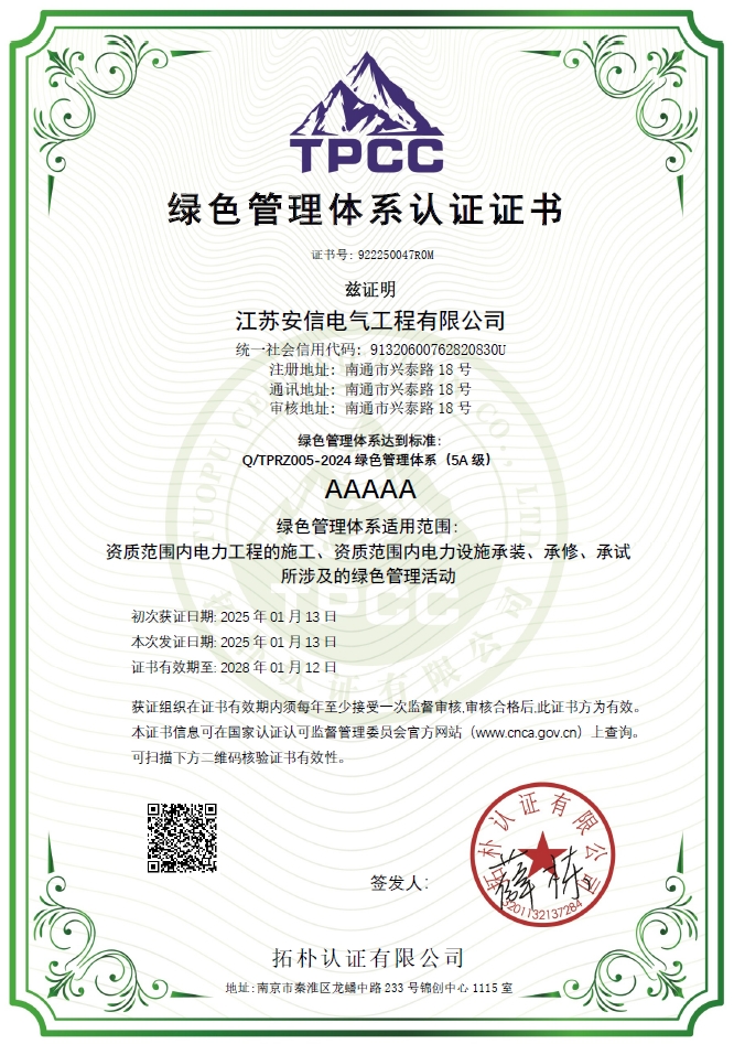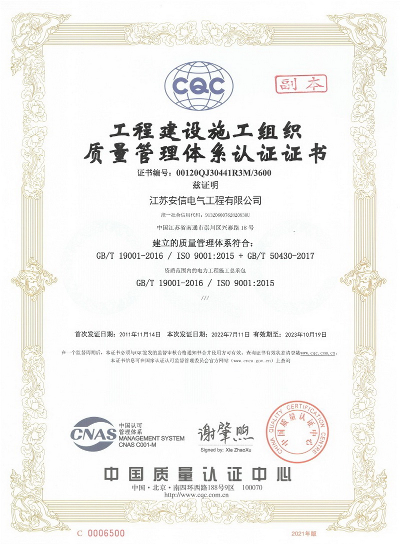 在創(chuàng)業(yè)之初,公司就堅(jiān)持高起點(diǎn)的戰(zhàn)略思路,廣納賢才,集聚行業(yè)精英,創(chuàng)新發(fā)展,做優(yōu)企業(yè)品牌。現(xiàn)已取得:承裝二級(jí)、承修二級(jí)、承試二級(jí),電力工程施工總承包二級(jí),輸變電工程專業(yè)承包二級(jí),建筑工程施工總承包二級(jí),建筑機(jī)電安裝專業(yè)承包二級(jí),地基基礎(chǔ)專業(yè)承包二級(jí)資質(zhì)證書,并通過了質(zhì)量、環(huán)境、職業(yè)健康和安全管理體系認(rèn)證,確保各項(xiàng)工作有序管控。